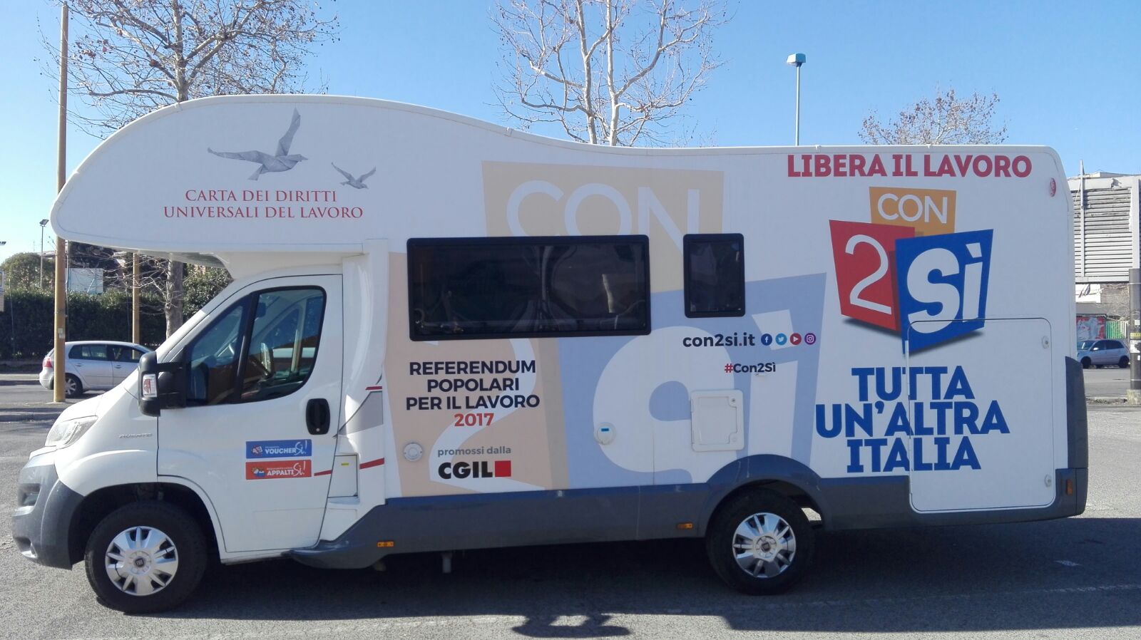 Da giovedì 2 marzo il Camper del Comitato #Con2sì della CGIL è a disposizione delle Compagne e dei Compagni della Camera del Lavoro di Frosinone e Latina. Sono stati già raggiunti i comuni di Formia e Cassino e sono in programma nei prossimi giorni numerose iniziative di volantinaggio ed informazione a sostegno del Sì nei due quesiti referendari. Ci impegneremo a raggiungere il maggior numero di comuni possibili nelle due province della nostra Camera del Lavoro in modo da informare e coinvolgere il maggior numero di cittadini nella nostra #SfidaxiDiritti che nasce dalla stesura della Carta dei Diritti Universali del Lavoro, dalla sua condivisione in centinaia di piazze d’Italia, in migliaia di luoghi di lavoro, tra la gente e con la gente. Questo percorso ha portato 4,5 milioni di firme raccolte per la proposta di legge di iniziativa popolare e per i quesiti referendari che la sostengono; ma è adesso che dobbiamo - tutti insieme - dare e fare il nostro meglio affinché sia possibile, iniziando dall'abrogazione dei voucher e dalla tutela delle lavoratrici e dei lavoratori degli appalti, DAVVERO CAMBIARE QUESTO PAESE.